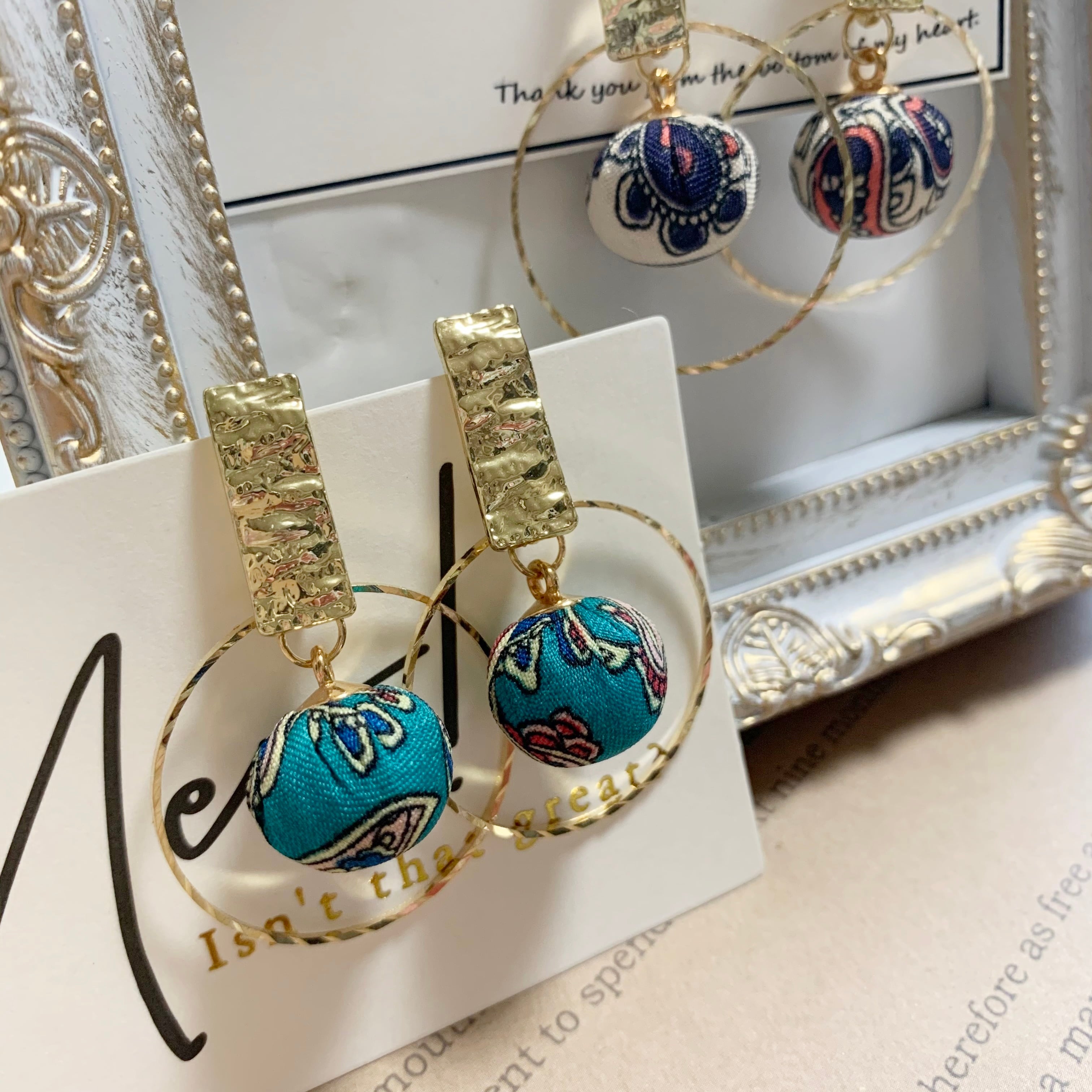 ホワイトカラーとグリーンカラーのペイズリー柄ポンポンボールとゴールドリングがゆらゆら揺れる♪ピアスです。