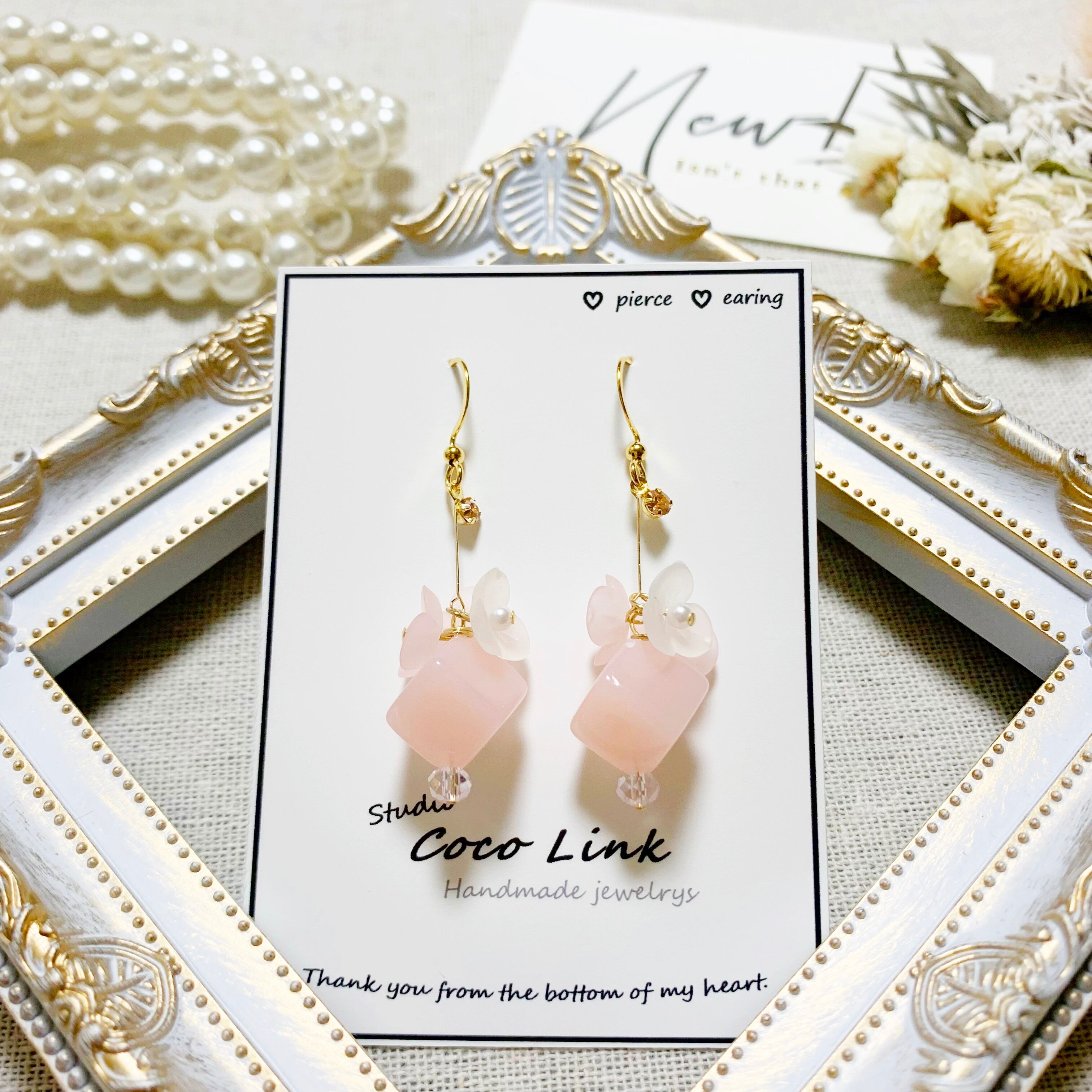 四角いブロックビーズとお花のビーズを組み合わせたゆれるピアス♪(イヤリング)