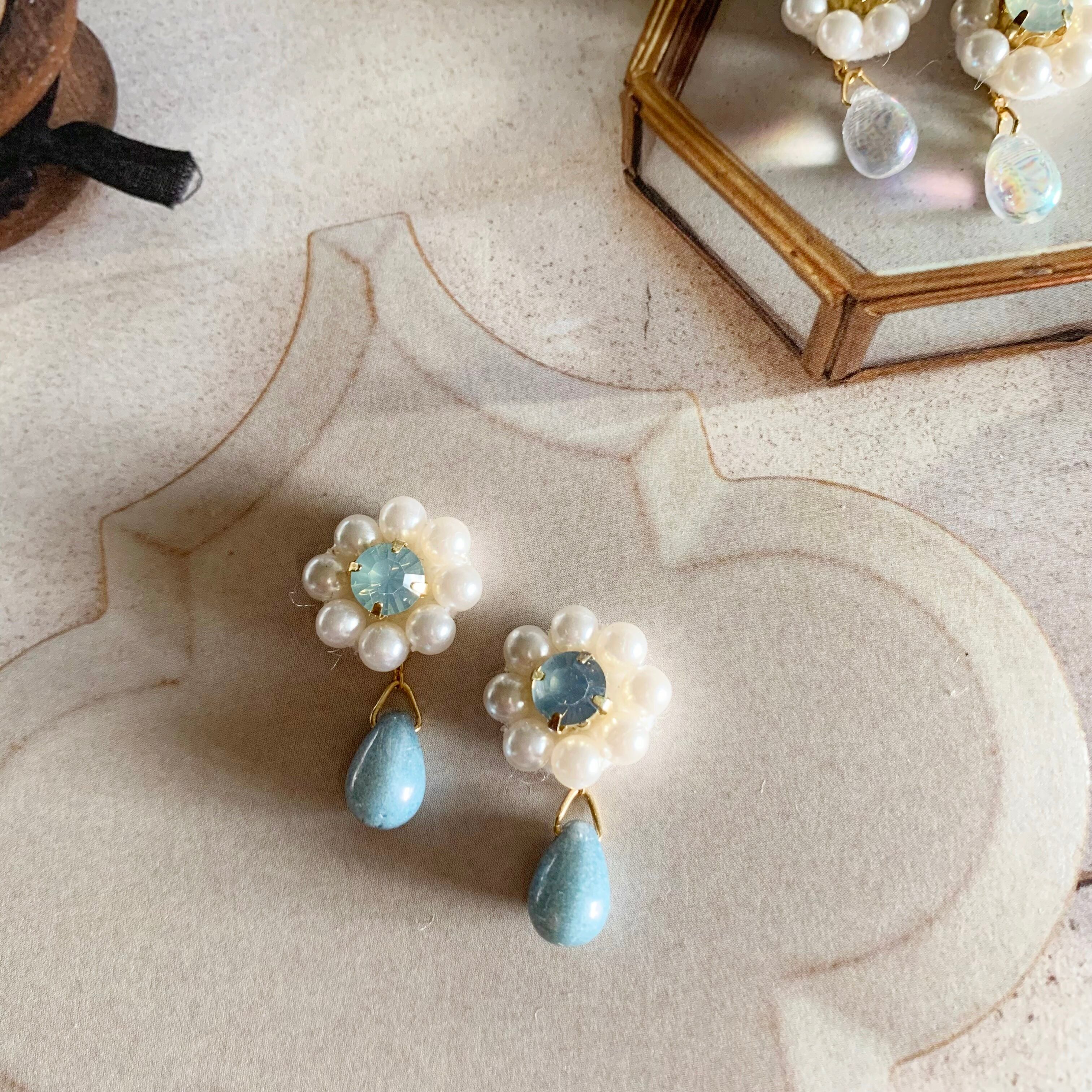 ガラスストーンのまわりにパールを一粒一粒縫い付け、チェコガラスビーズをぶら下げました。小さなチェコガラスビーズがゆらゆら揺れてかわいいです♪