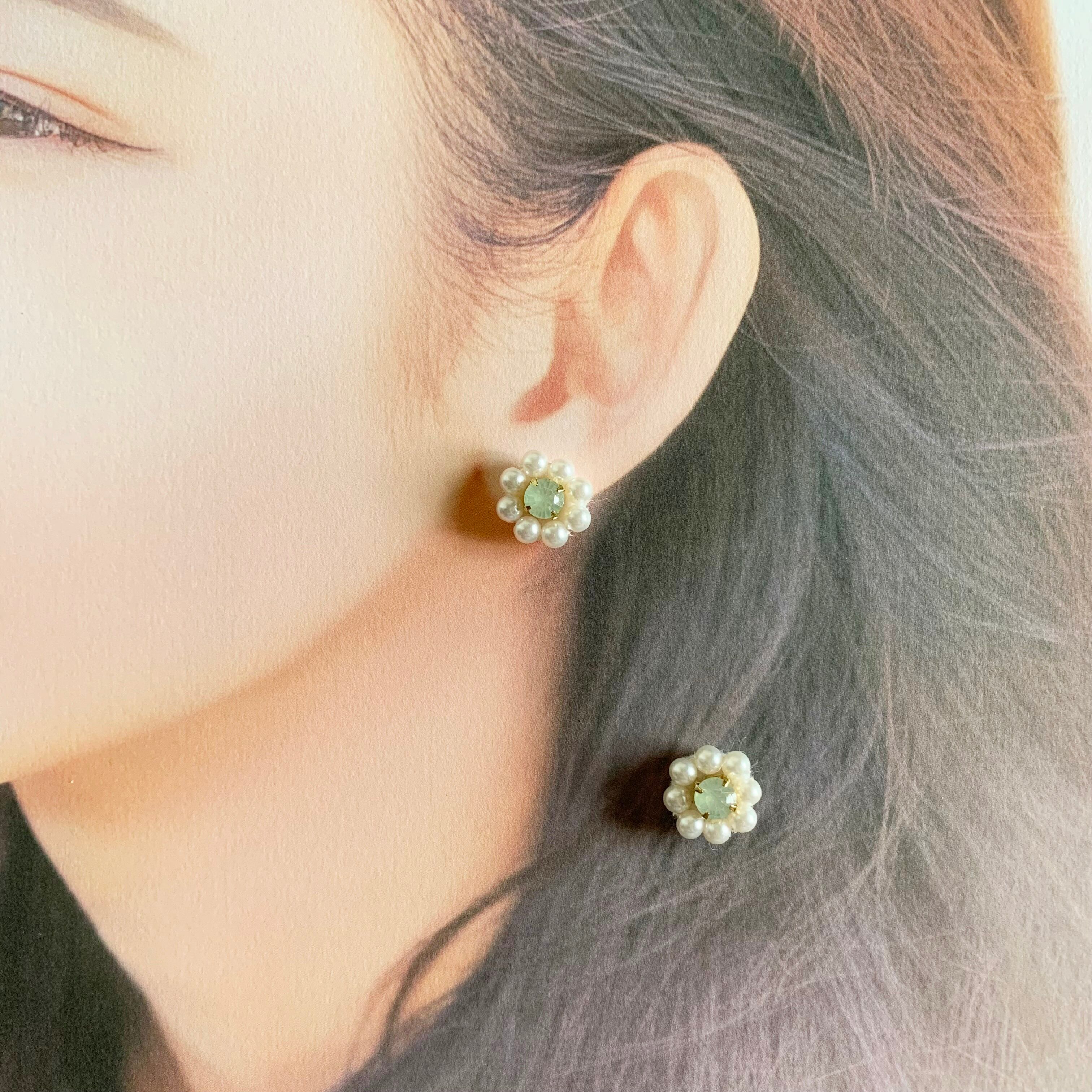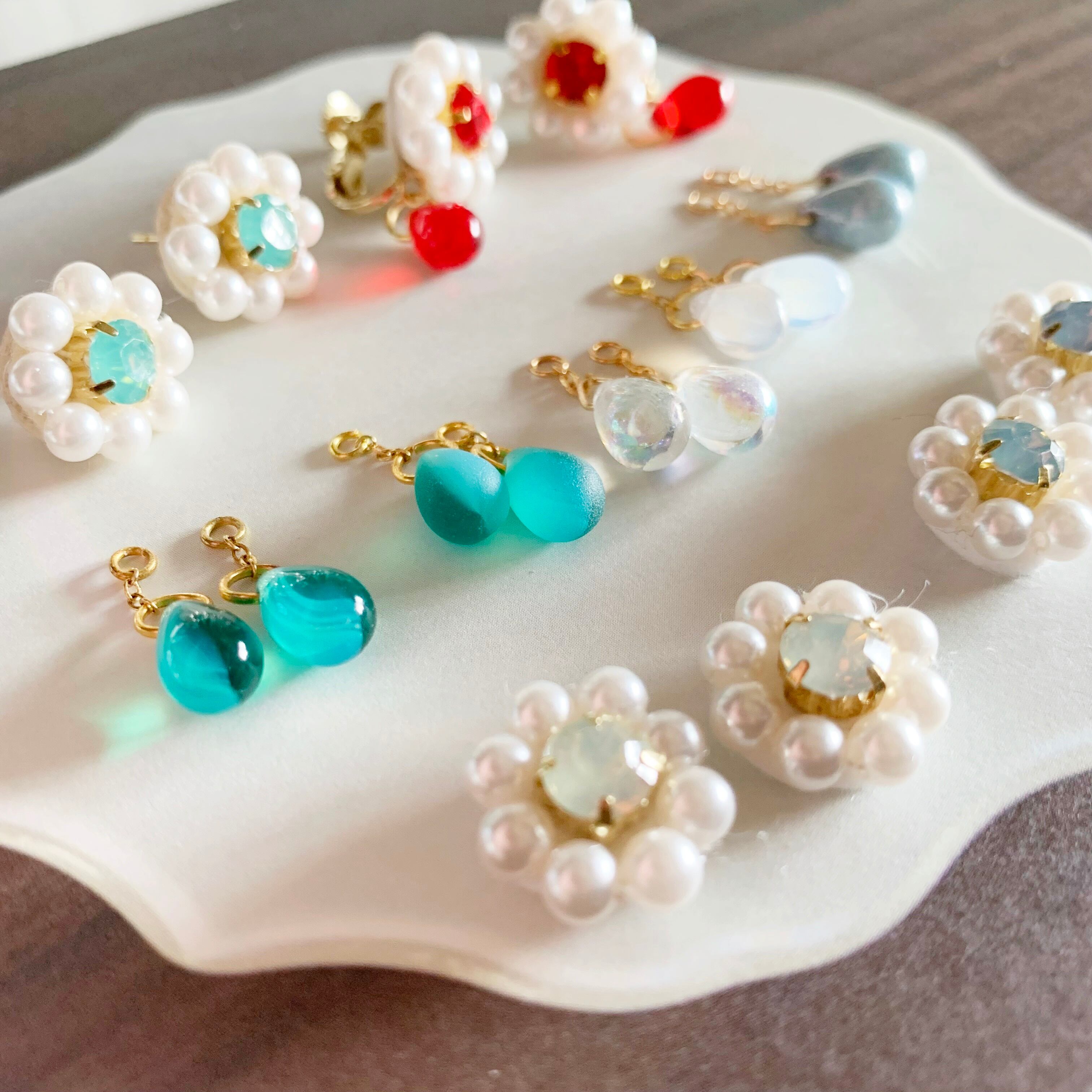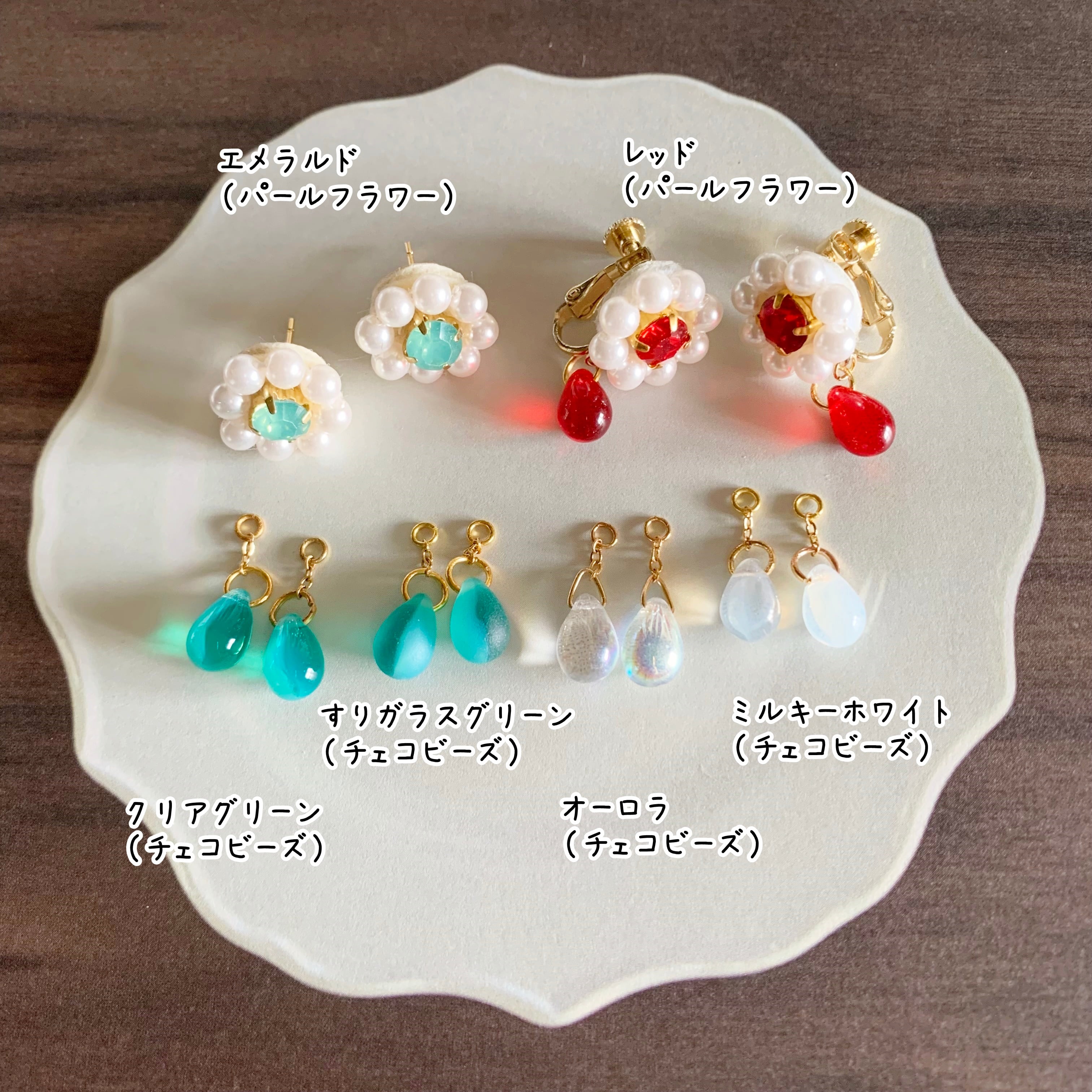 ●パールフラワー部分のガラスストーンは【エメラルド】【ミルキーホワイト】【ミルキーブルー】【レッド】の4色からお選びください。