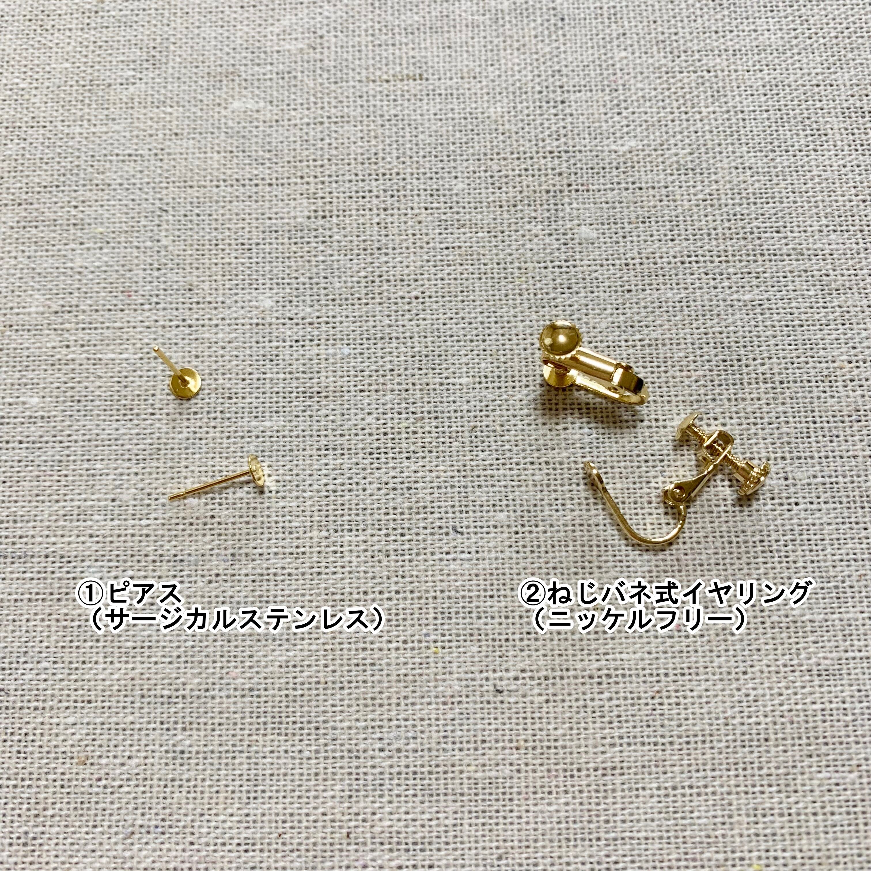 少しでも長く、綺麗な状態でご使用いただければと思いまして、ピアスにつきましてはサージカルステンレス、イヤリングにつきましてはサージカルステンレス、ニッケルフリー、樹脂の取り扱いとさせていただきます。