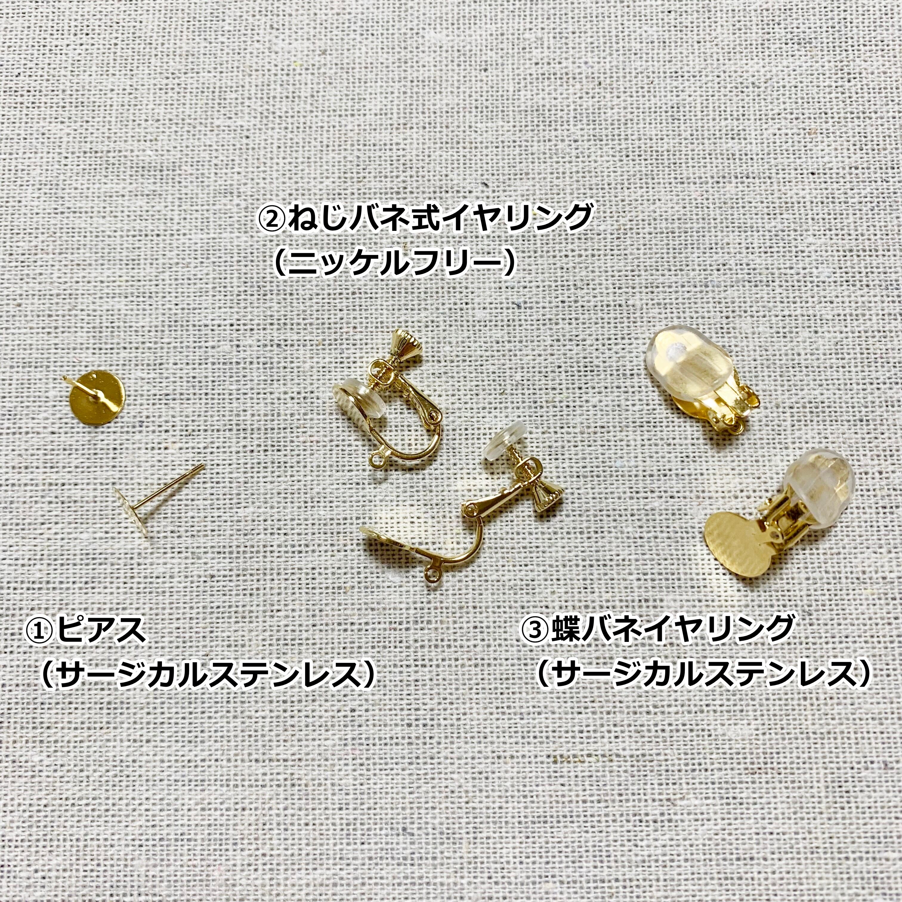 少しでも長く、綺麗な状態でご使用いただければと思いまして、ピアスにつきましてはサージカルステンレス、イヤリングにつきましてはサージカルステンレス、ニッケルフリー、樹脂の取り扱いとさせていただきます。