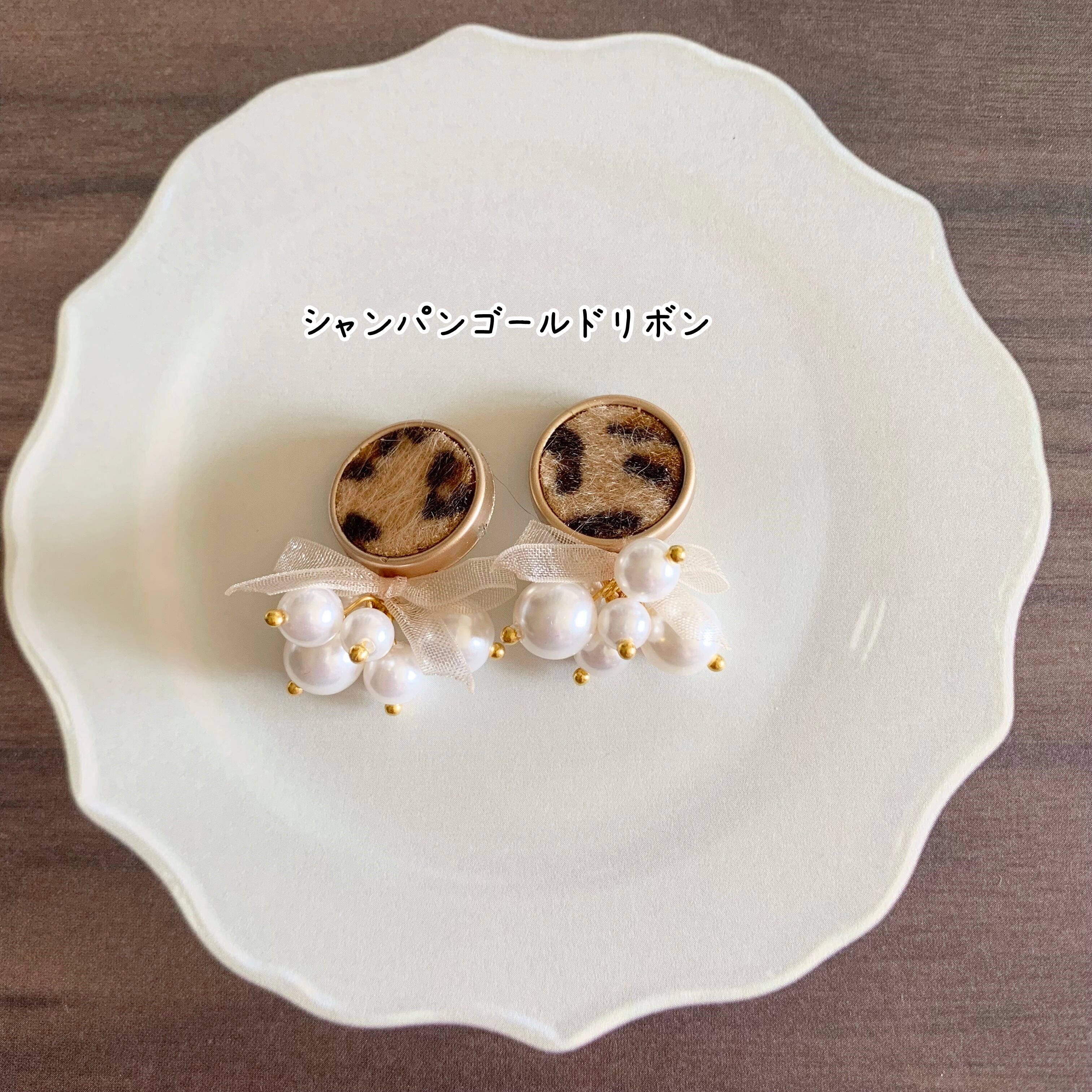 まぁるい起毛のレオパードカボションに大きさの異なるパールをじゃらじゃら~♪
